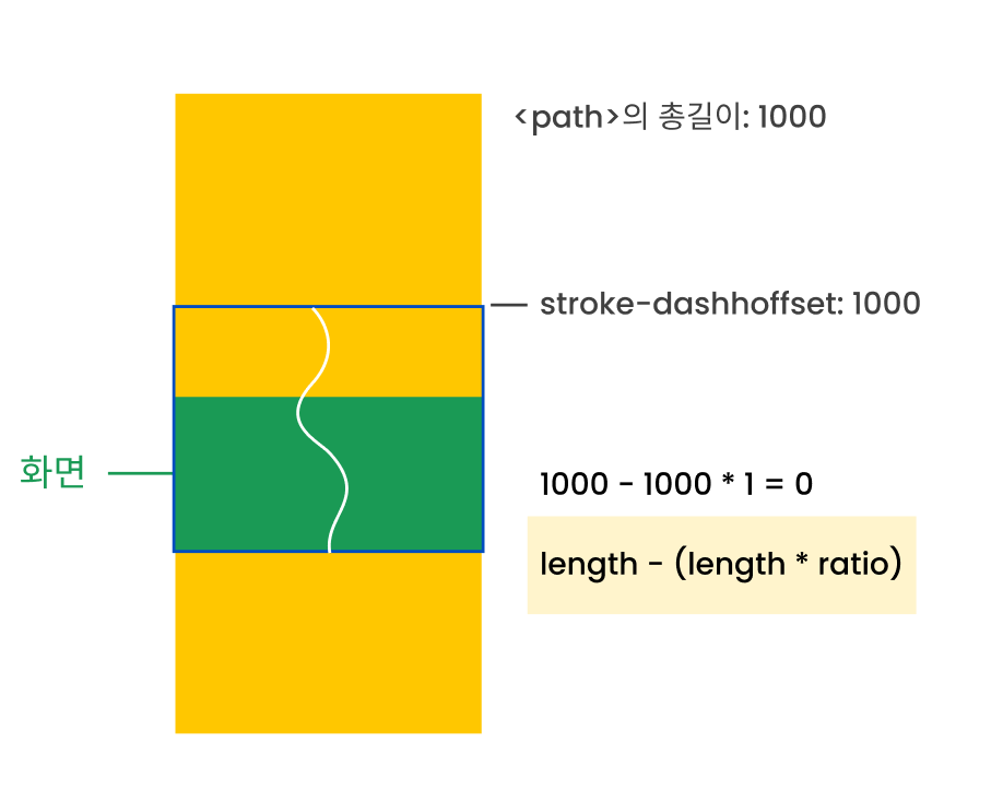 <path> 앨리먼트의 총길이인 length가 1000px이고 화면이 <path>가 시작되는 지점에 위치해 있을 때