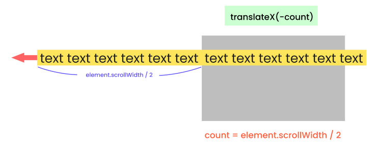 animate라는 재귀 함수를 만드는데 translateX처리는 따로 marqueeText라는 함수로 빼서 처리해 줍니다.