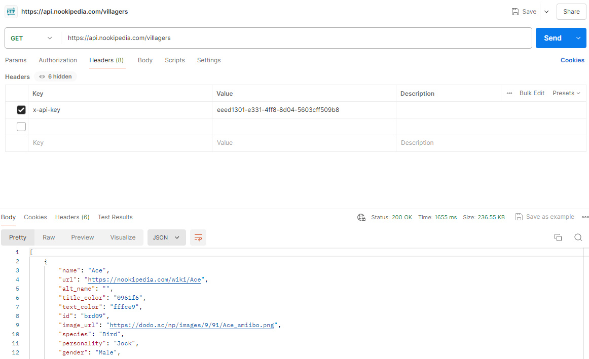 동물의 숲 관련 페이지를 만들어 보고 싶어서 API 키를 요청했다.